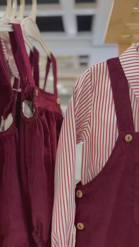 Jardineira em tecido bombazine na cor Bordeaux, inspirada nas cores do outono. Uma peça que acompanha os primeiros passos com conforto e estilo.